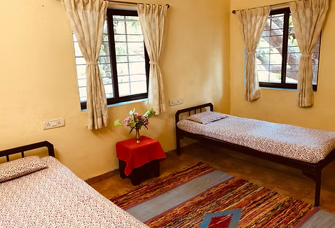 Punarnava offers comfortable and aesthetically pleasing accommodations. There are two room options: Regular and Deluxe. Both have two single beds and an attached bathroom. Deluxe rooms are bigger in size and have an extra dressing space adjacent to the bathroom.